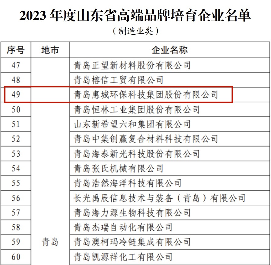 日前,山東省市場監(jiān)督管理局公布了“2023年度山東省高端品牌培育企業(yè)”名單,青島惠城環(huán)??萍技瘓F(tuán)股份有限公司榜上有名。